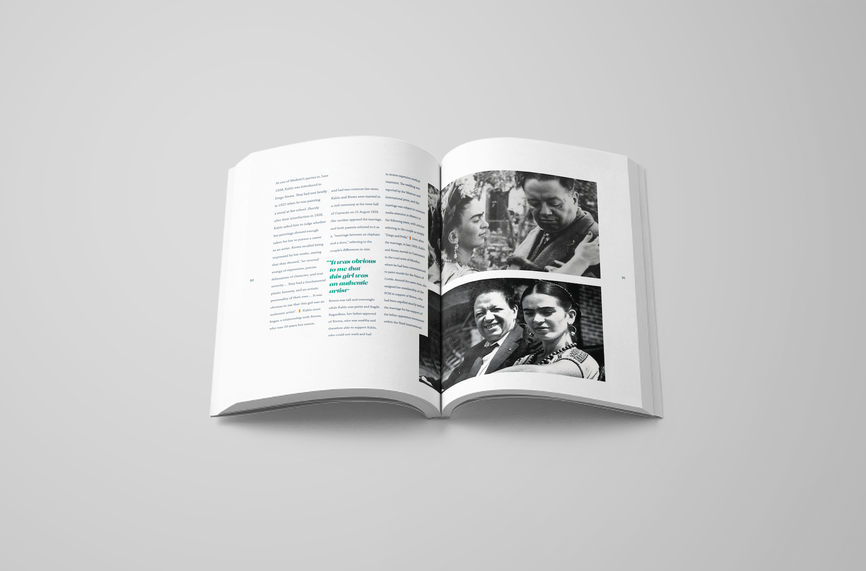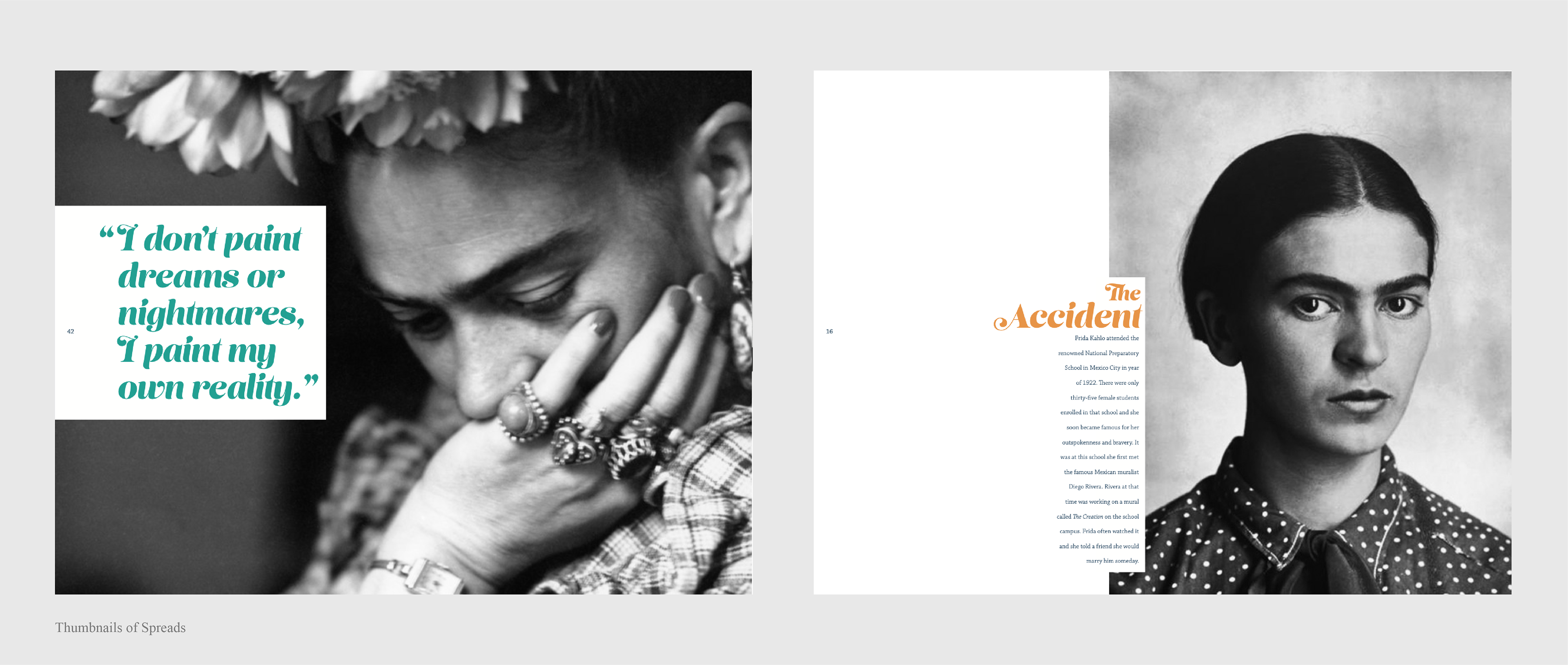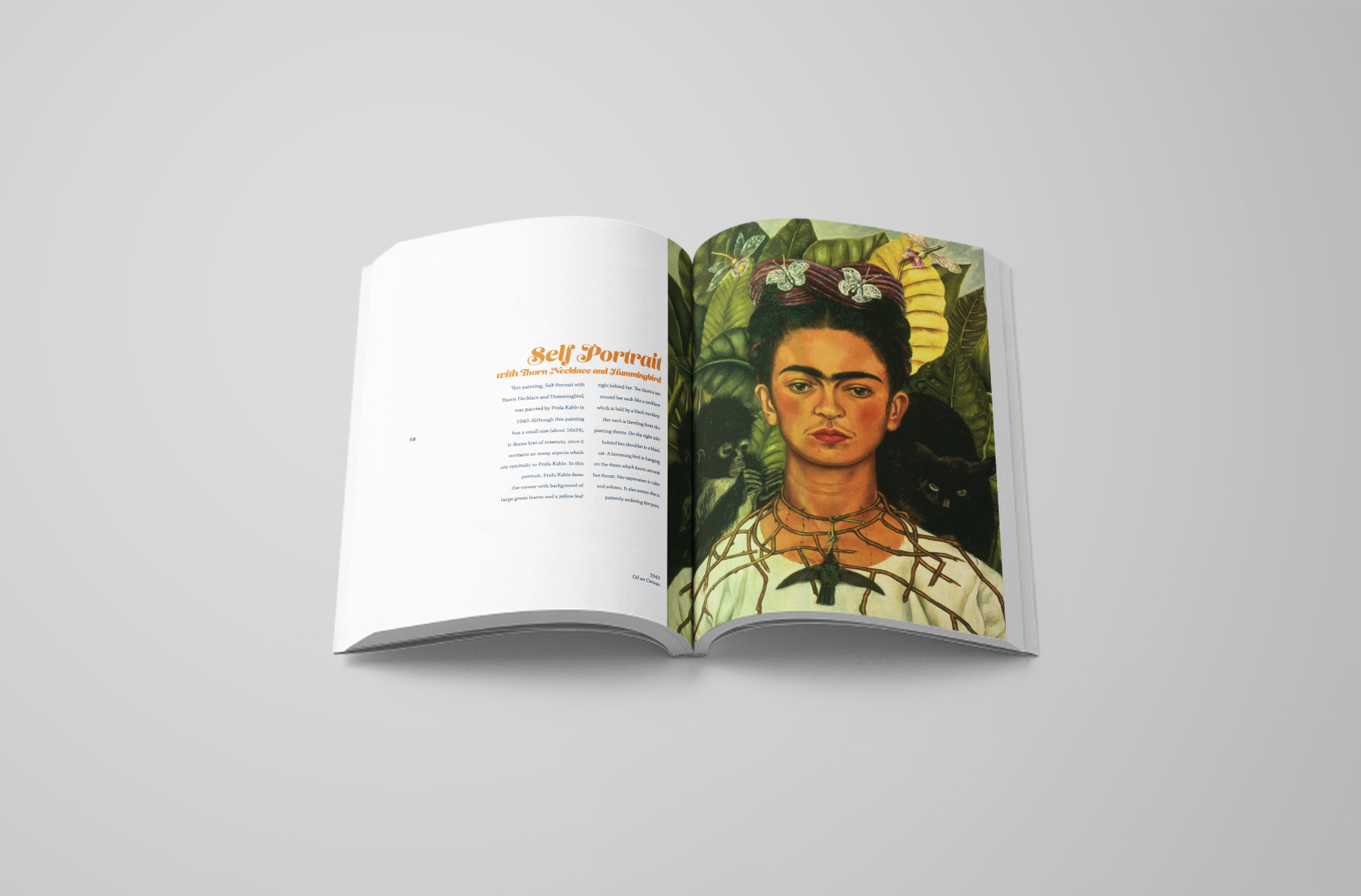 This chapbook focuses on Frida Kahlo's prolific life and work and dives deep into why she made what she did and for whom she made them. The wrap-around cover reveals a gallery of her famous self-portraits, and the spreads display her work in a clean, modern way. This book spans her whole life and is injected with several artworks to show how her experiences affected her career. A bright, Mexican art color palette is paired with her paintings to compliment her style.