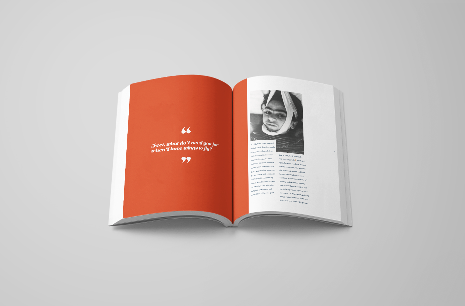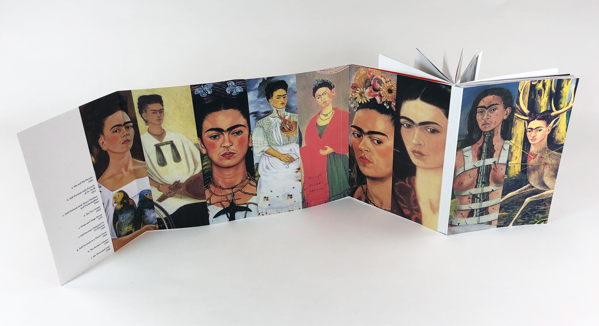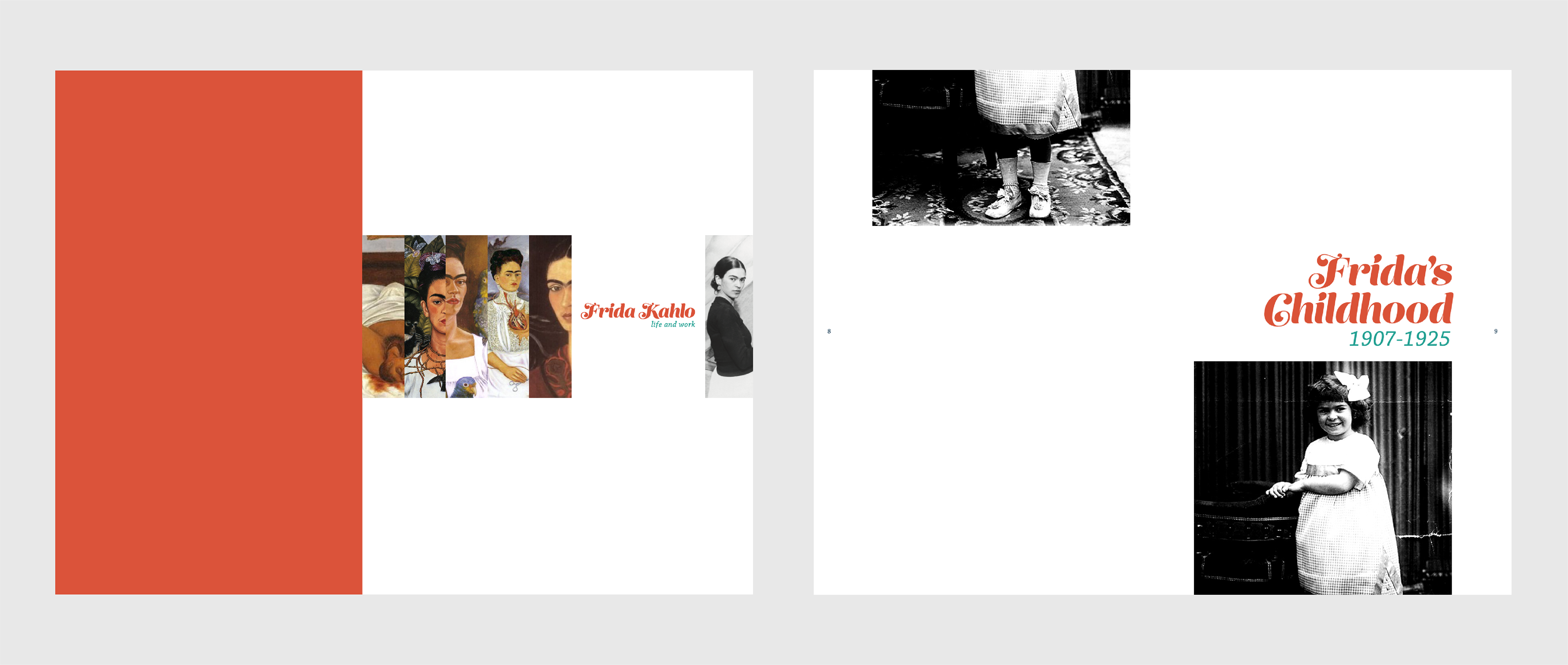 This chapbook focuses on Frida Kahlo's prolific life and work and dives deep into why she made what she did and for whom she made them. The wrap-around cover reveals a gallery of her famous self-portraits, and the spreads display her work in a clean, modern way. This book spans her whole life and is injected with several artworks to show how her experiences affected her career. A bright, Mexican art color palette is paired with her paintings to compliment her style.