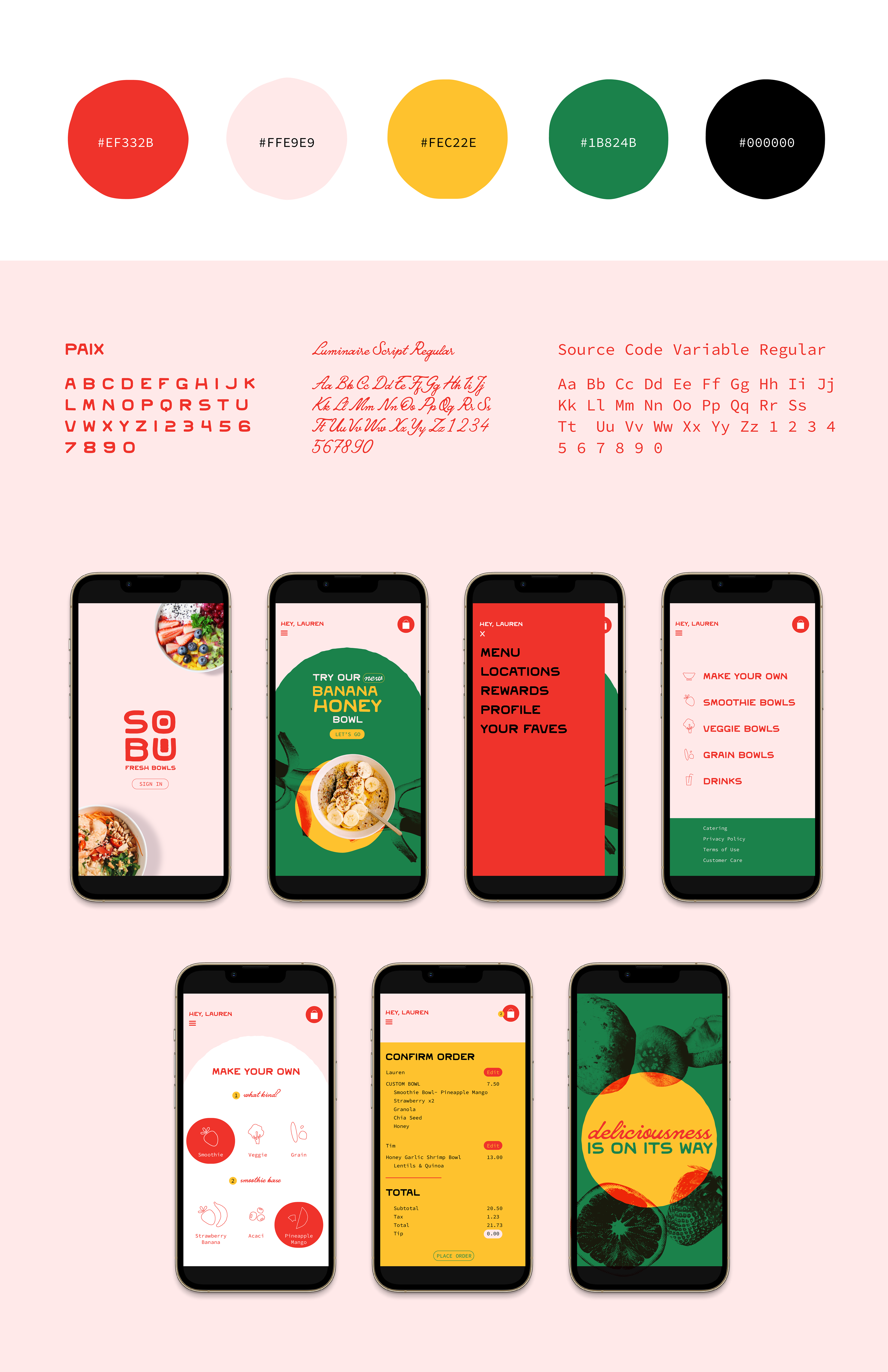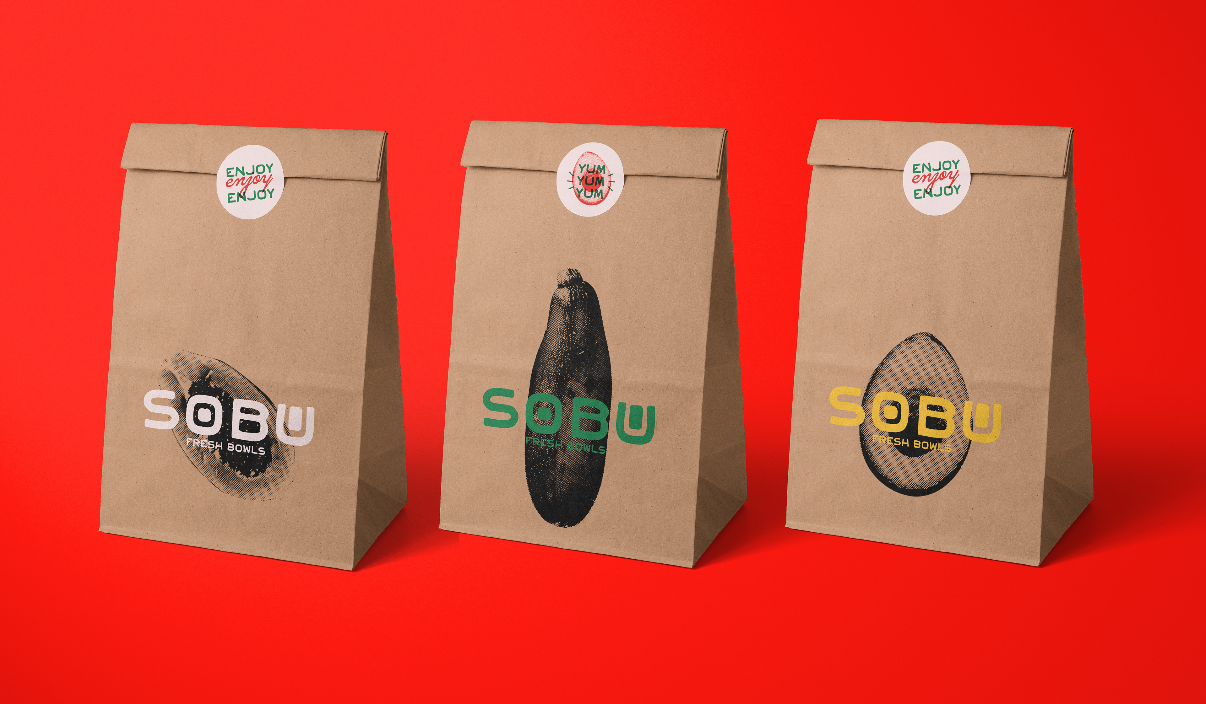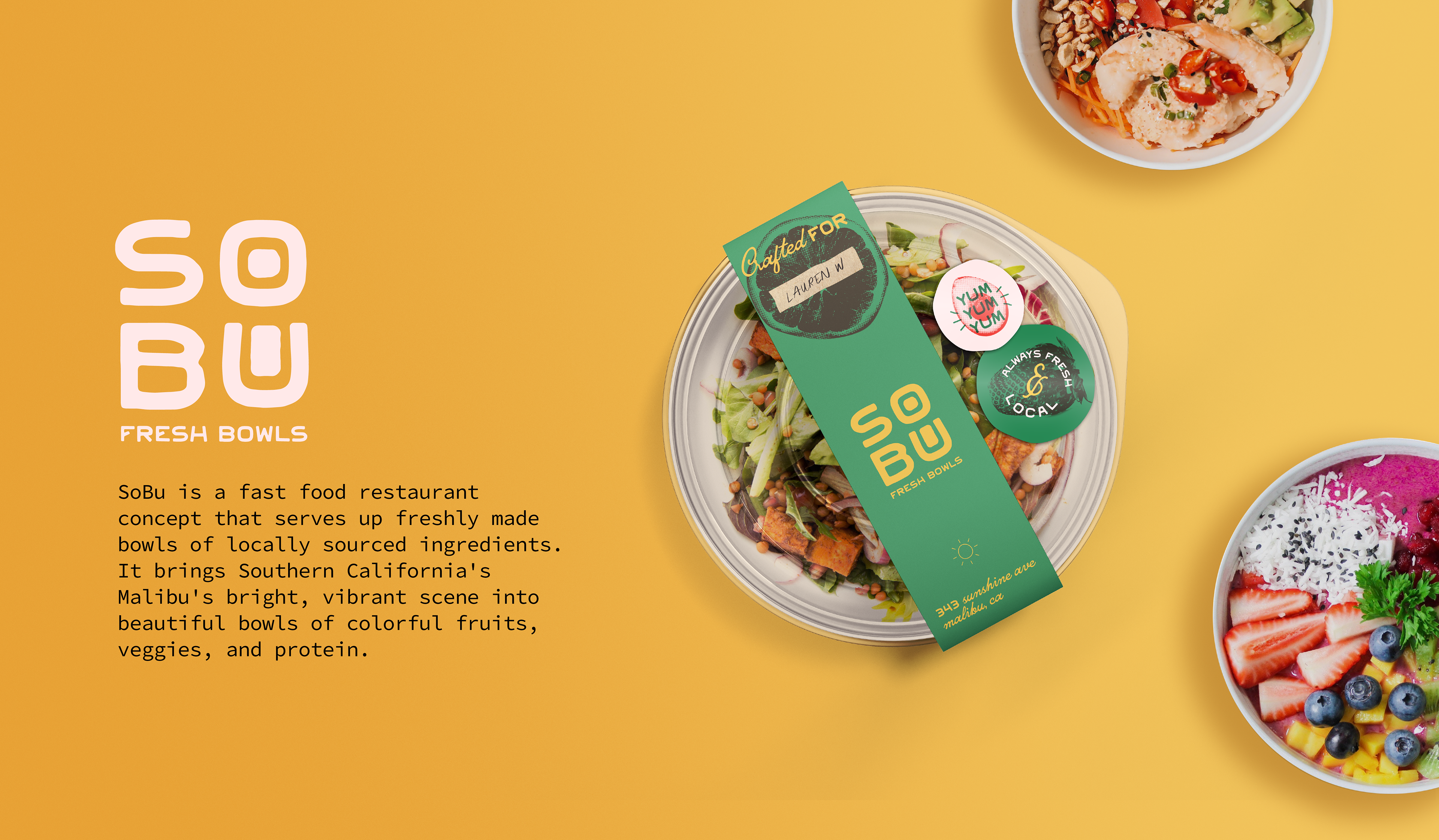 SoBu is a fast food restaurant concept inspired by the colors and fresh produce of Southern California. The color palette represents the nature and sunshine of the golden state and reflects the colorful dishes served. The typography and shapes have irregular edges translating an organic, fresh feeling throughout the brand. Screen-printed images of fruits and veggies create exciting silhouettes and add to the hand-crafted feeling of the brand.
